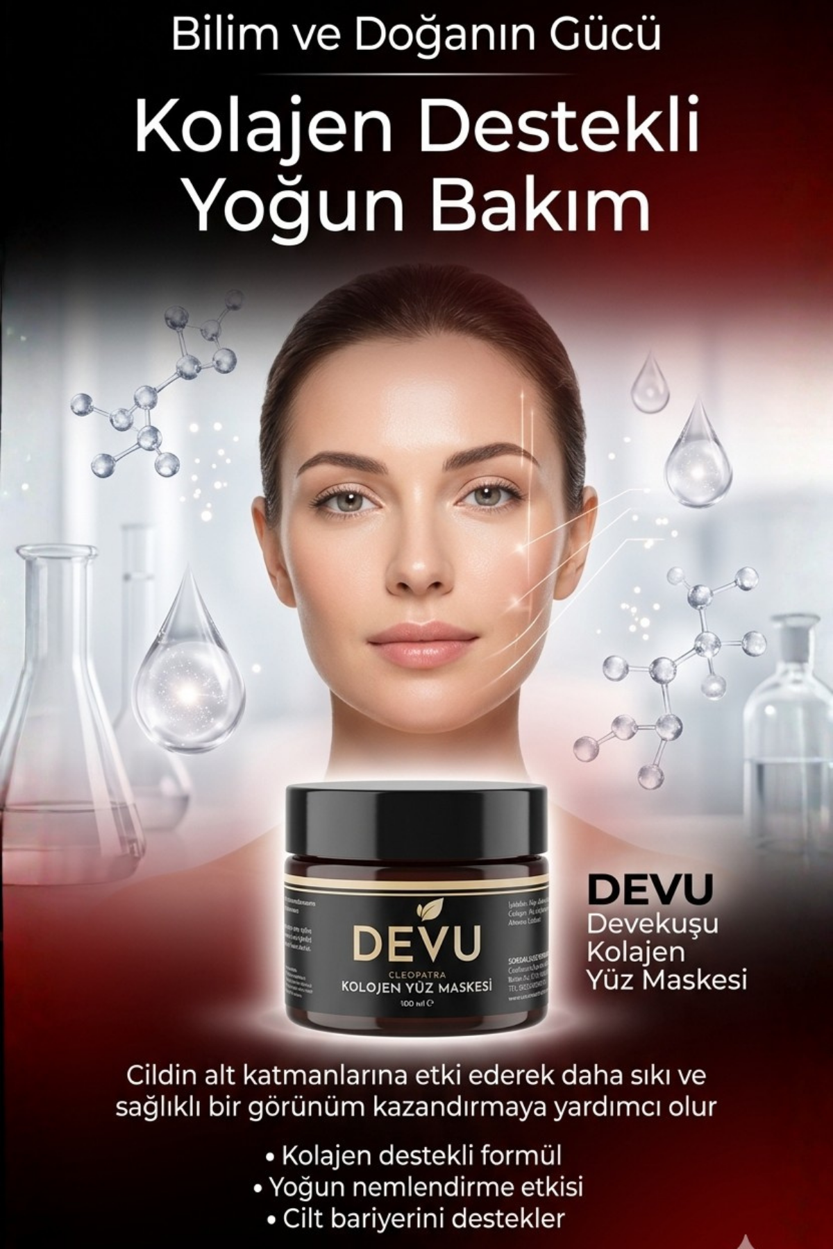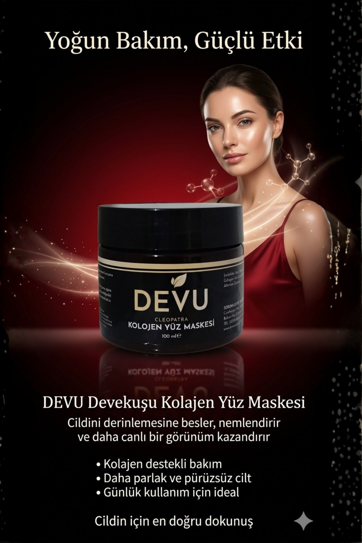 DeveKuşu kolajen maskesi, cilt yapısını derinlemesine besler ve yeniler. Kolajen proteinleri cildin nem bariyerini güçlendirerek dehidratasyonu önler. Ince çizgiler ve kırışıklıklar belirgin şekilde azalır, cilt tonu eşitlenir. Antioksidan özellikleri sayesinde çevresel hasarlardan koruma sağlar. Düzenli kullanımda cilt sıkılığı artar, gözenekler küçülür. Doğal bileşenlerin sinerjik etkisi ile cildin kendi yenileme mekanizması desteklenir. Sonuç: Daha genç, canlı ve radyant bir cilt görünümü.Share